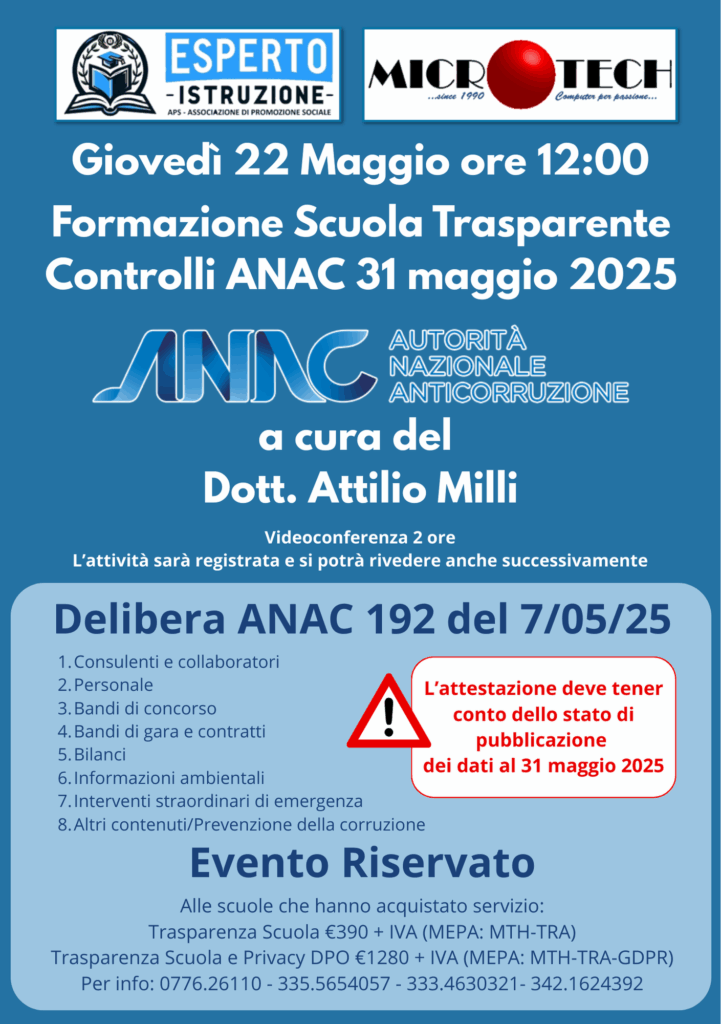 vi invitiamo a partecipare all’evento formativo Scuola Trasparente e i controlli ANAC – Delibera ANAC 192 del 7/05/2025